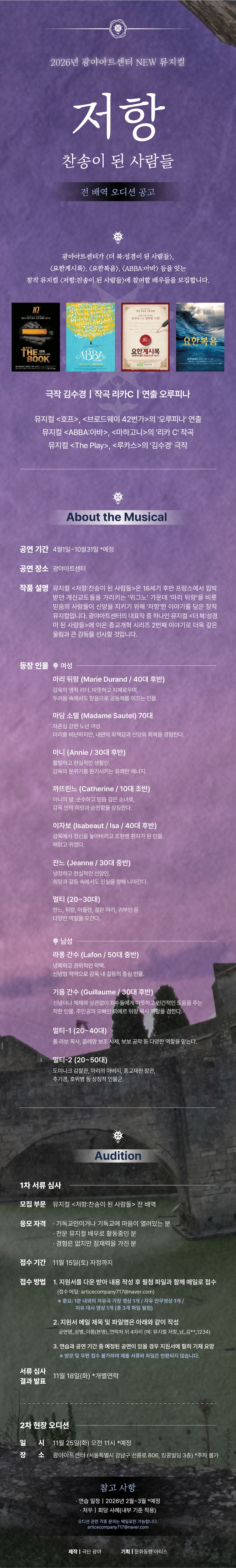 2026 광야아트센터 New 뮤지컬 <저항: 찬송이 된 사람들> 전 배역 오디션