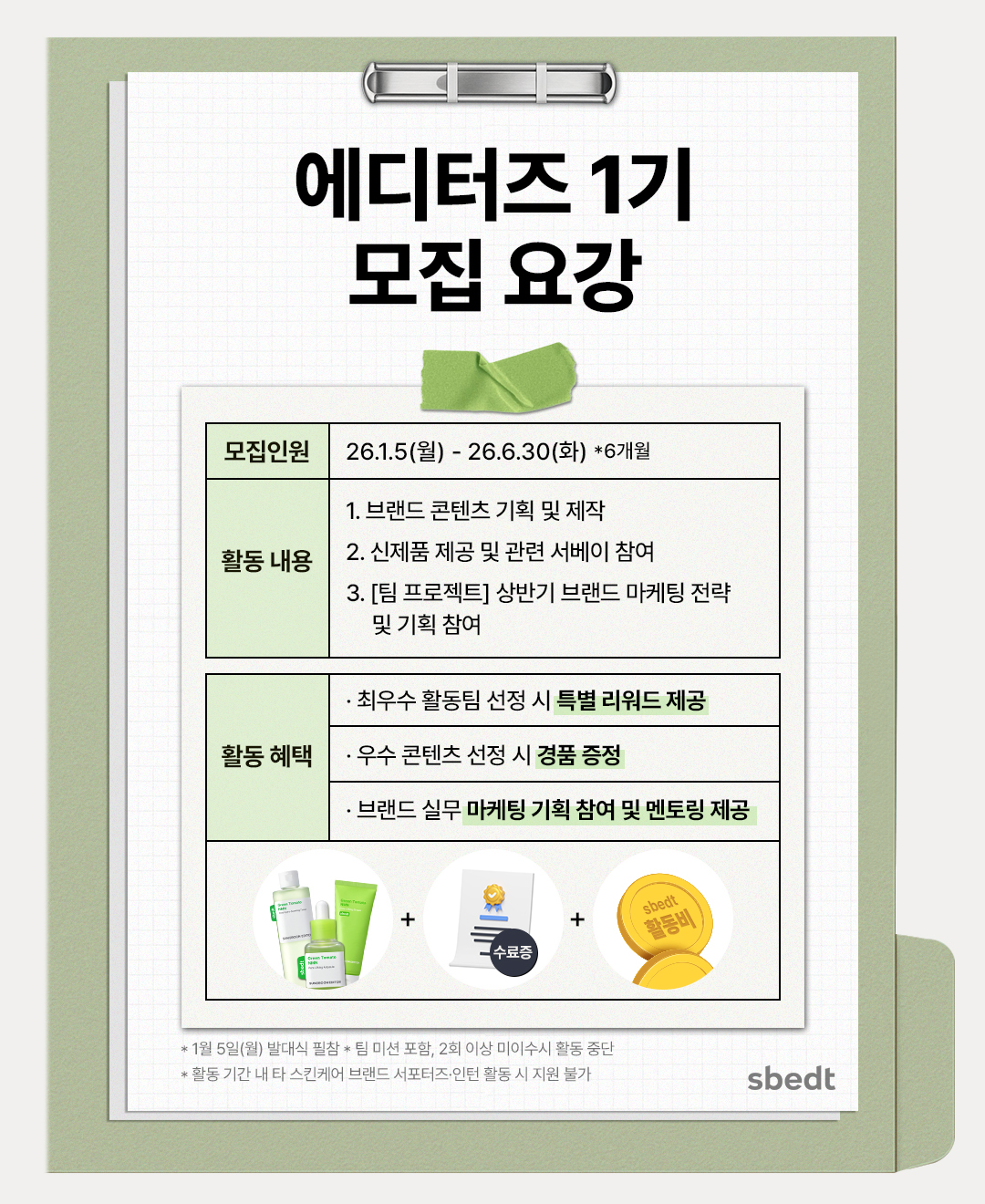 - 성분에디터 브랜드에 애정이 많고, 다양한 아이디어를 제안할 수 있는 대학교 재ㆍ휴학생