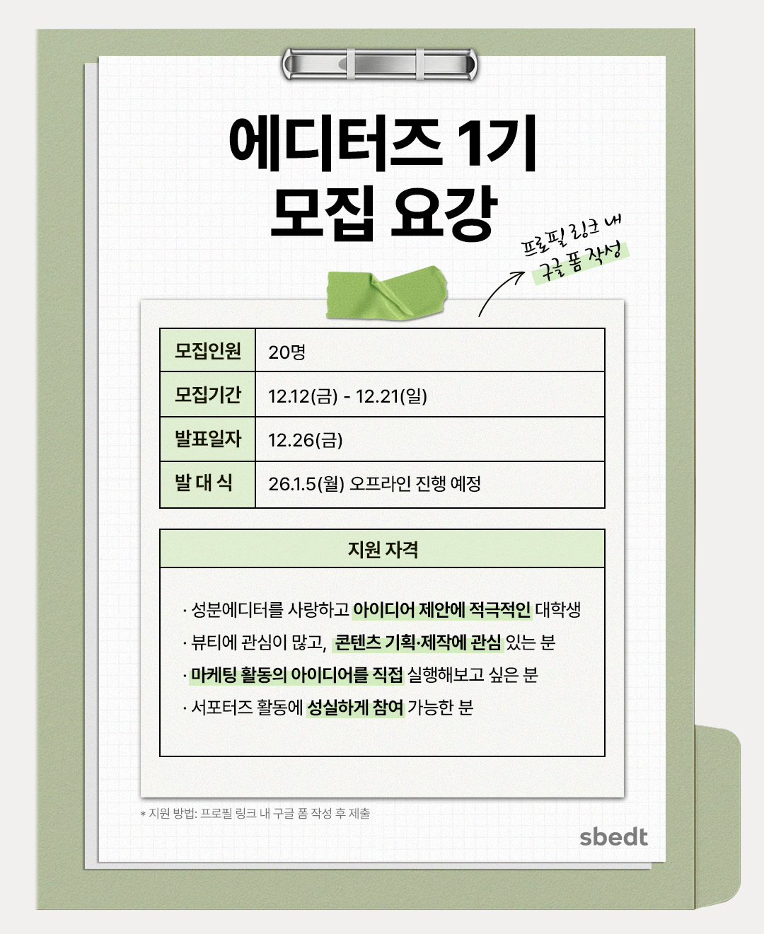 대학생 여러분과 성분에디터가 만나 뷰티 트렌드를 이끌어갈 에디터즈 1기를 찾고 있습니다.