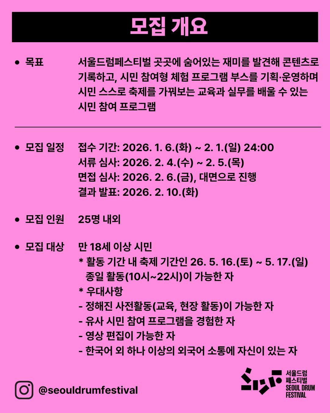 ※ 본 공고는 「2026 서울드럼페스티벌 드럼팬 참가시민 모집」에 포함된 ‘드럼팬 시민기획단’ 모집을 단독으로 안내하는 공고입니다. 모집 내용 및 지원 조건은 기존 공고와 동일합니다.