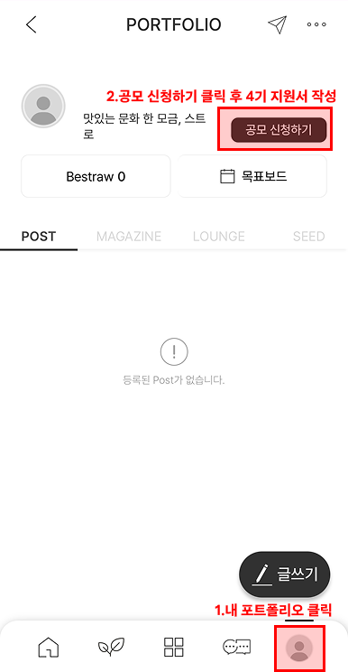 · 스트로 앱/웹 접속 > 오른쪽 하단 내 포트폴리오 클릭 > 좌측 상단 공모 신청하기 버튼 클릭 > 컬쳐메이트 4기 지원서로 이동