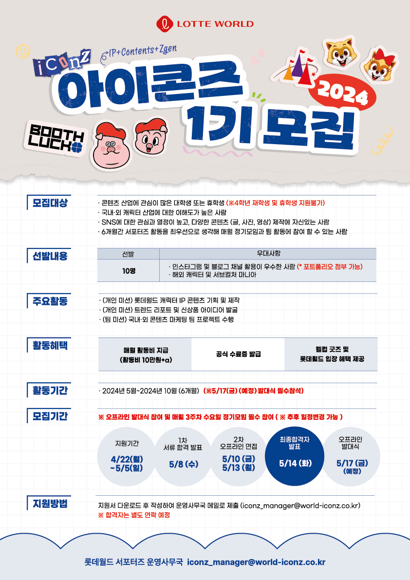 캐릭터, 서브컬처에 대한 이해도가 높은 대학생을 롯데월드 서포터즈로 모집합니다!