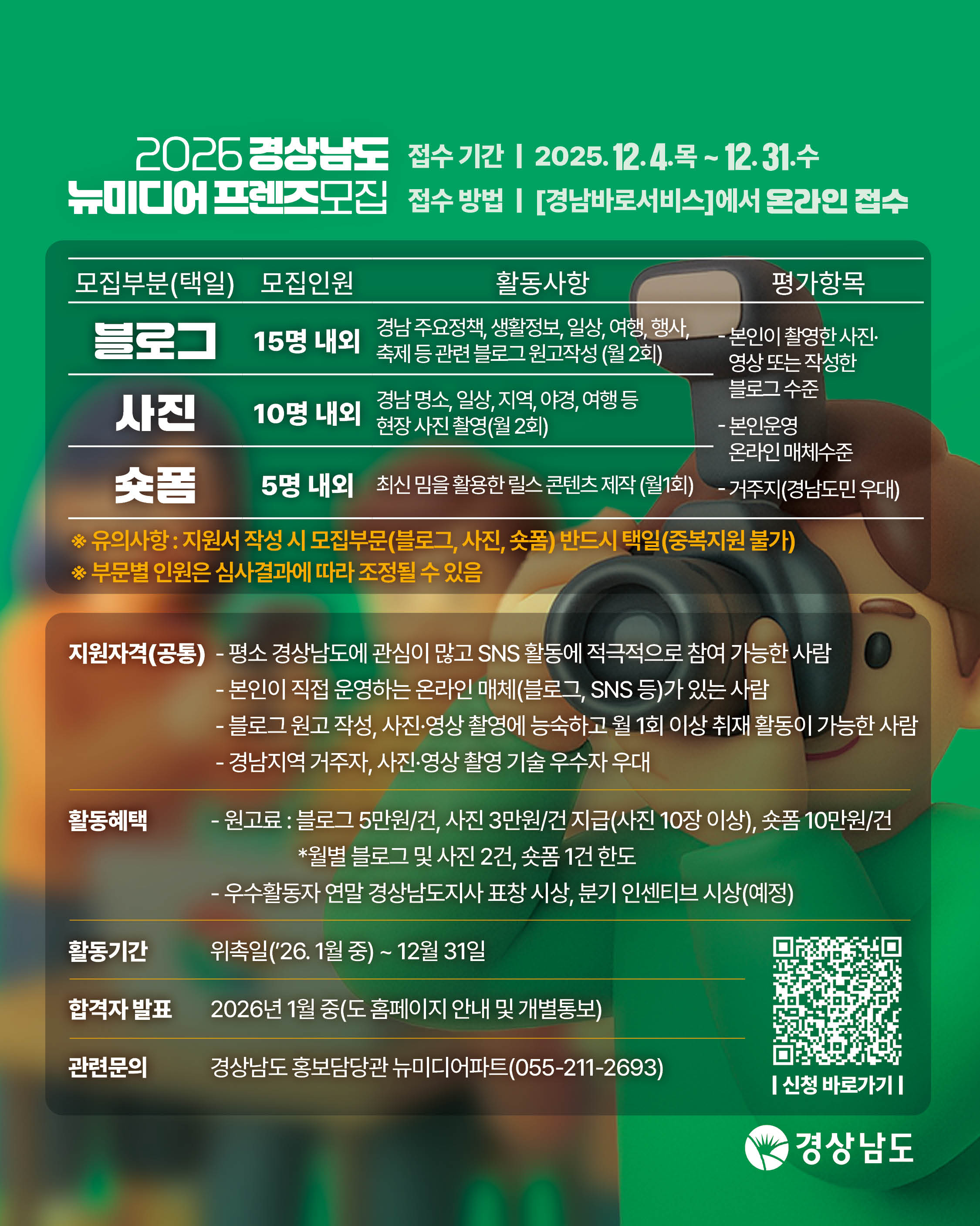 - 사진 부문 : 경남 명소, 일상, 지역, 야경, 여행 등 현장 사진 촬영(월 2회)