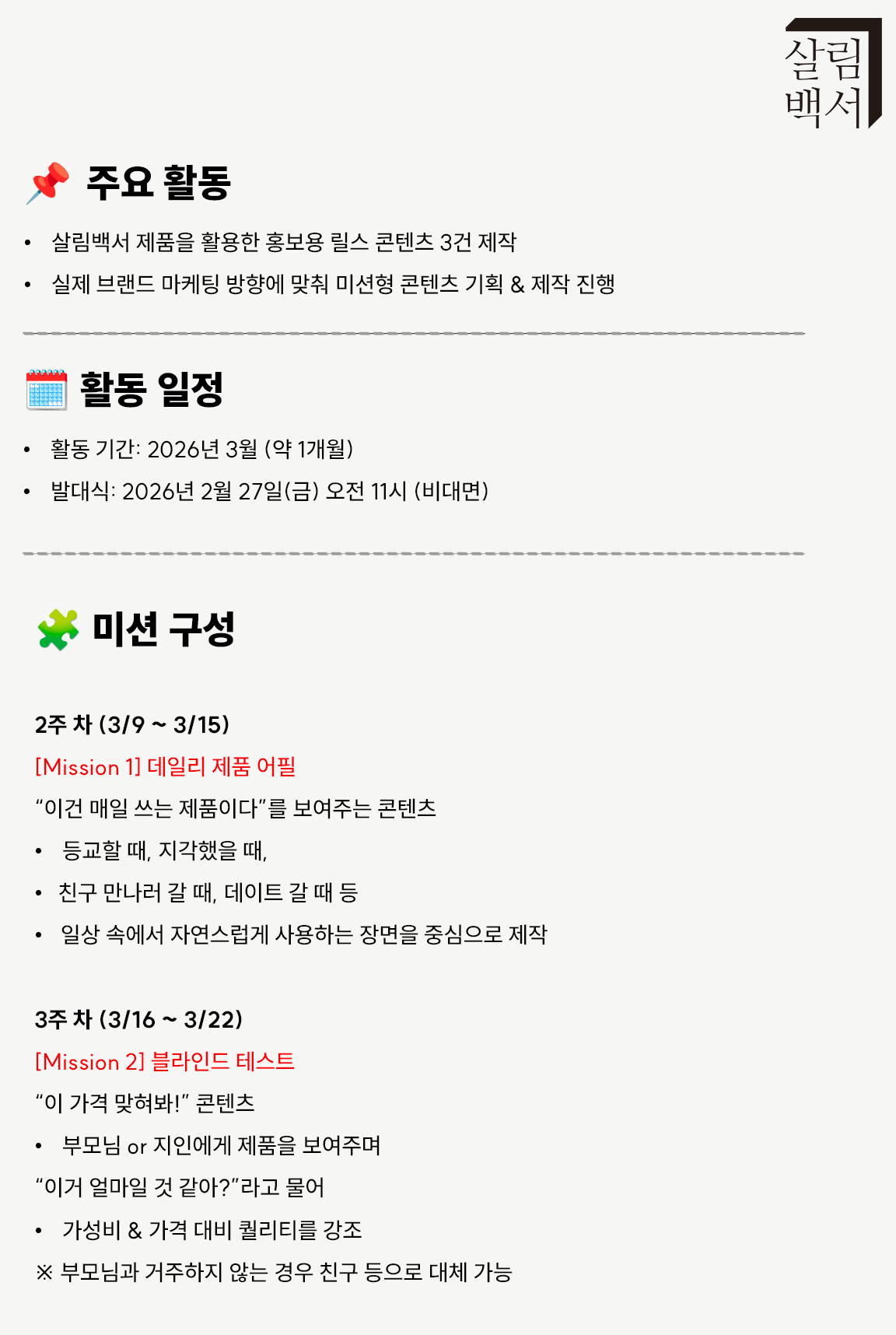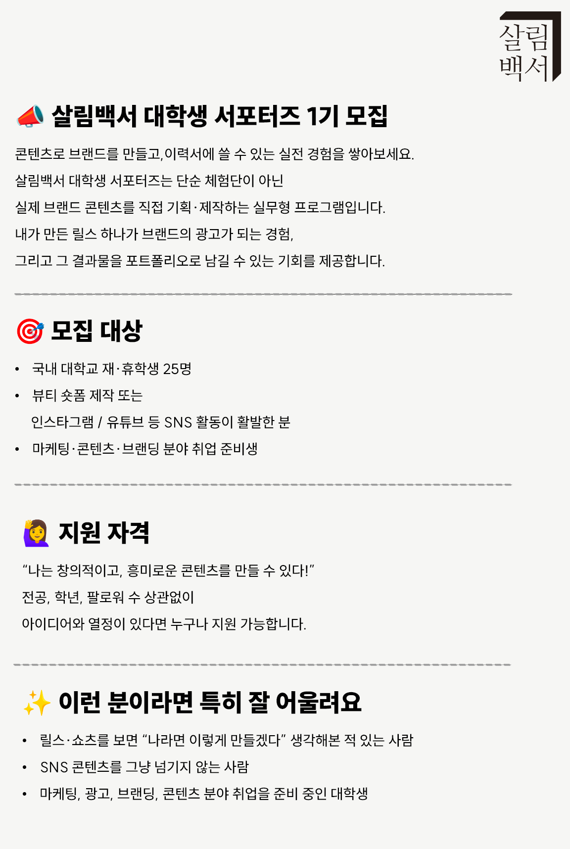 뷰티/생활용품 브랜드 '살림백서'의 뷰티 제품인 살림백서 제로와 함께 톡톡 튀는 숏폼 콘텐츠를 만들어갈 1기 서포터즈를 모집합니다. 단순 체험단이 아닌, 콘텐츠를 직접 기획하고 제작하는 실무형 마케팅을 경험해보세요!