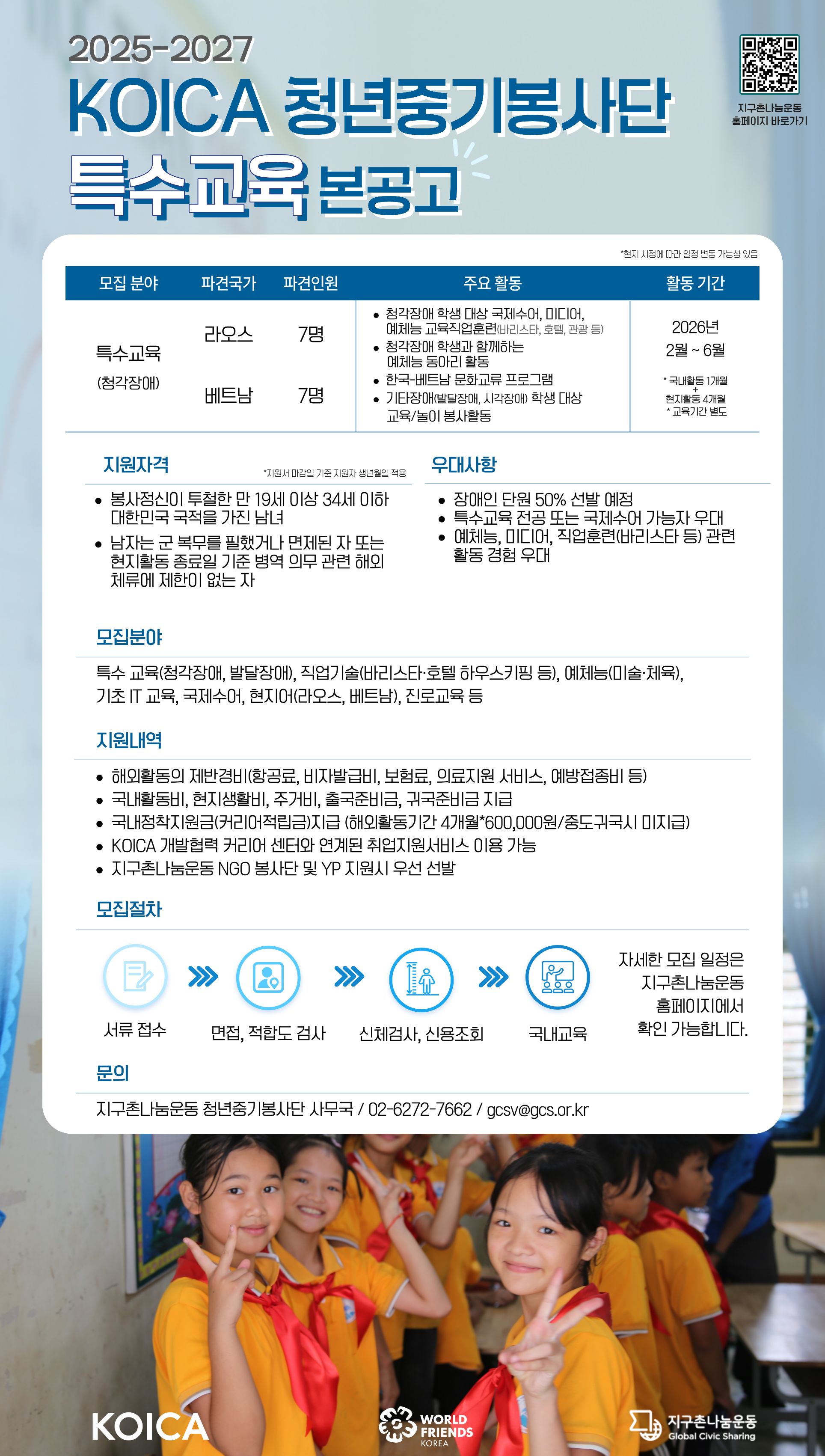 [청년중기봉사단] 2025-2027 KOICA 청년중기봉사단(특수교육) 1차 단원 모집 본공고
