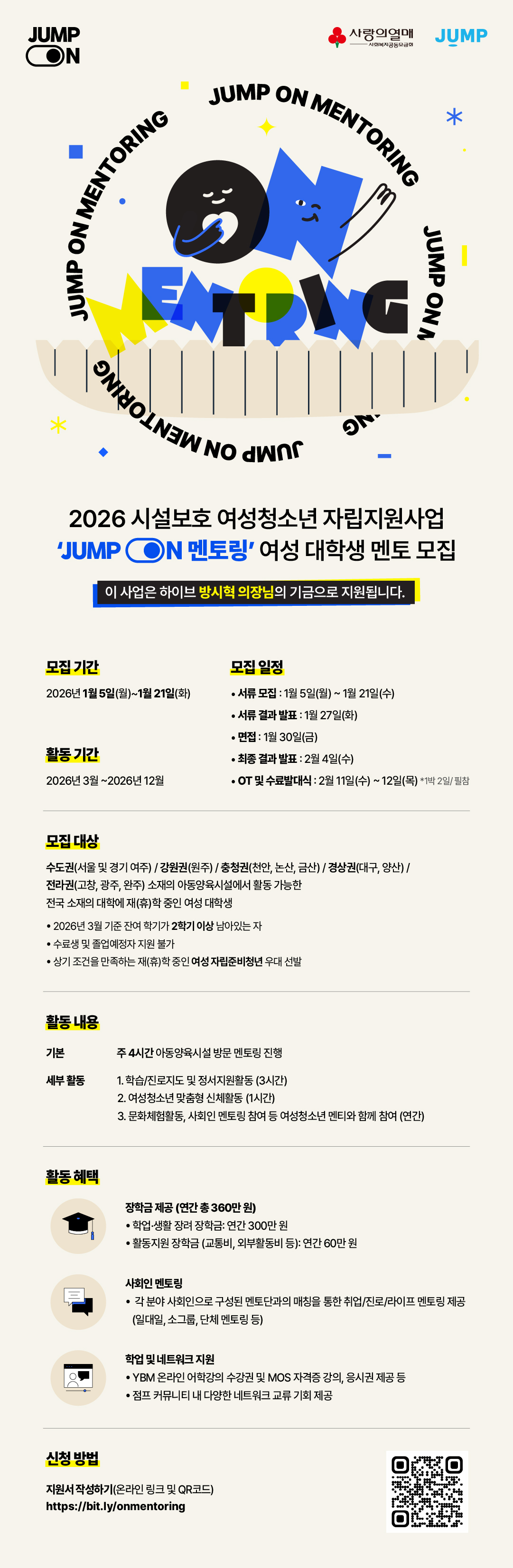 2026 시설보호 여성청소년 자립지원사업 「JUMP ON 멘토링」에서 활동할 여성 대학생 멘토를 모집합니다.