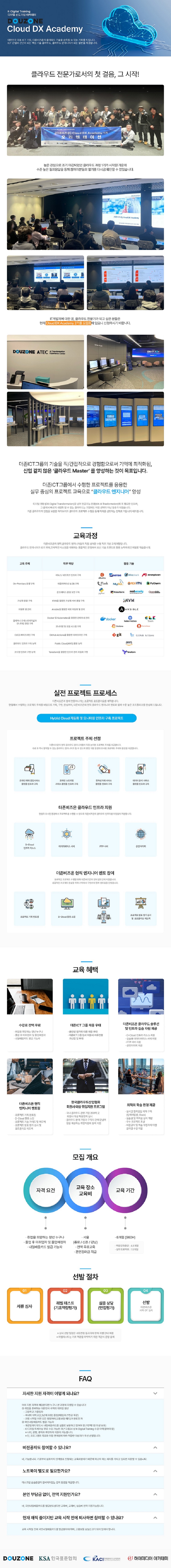 대한민국 대표 ICT 기업 더존비즈온이 설계한 체계적인 클라우드 커리큘럼으로 디지털 전환(DX) 시대를 선도할 핵심 기술을 배울 기회! 실무 중심 교육과 취업 연계 지원으로 여러분의 커리어 성장을 적극 지원합니다.
