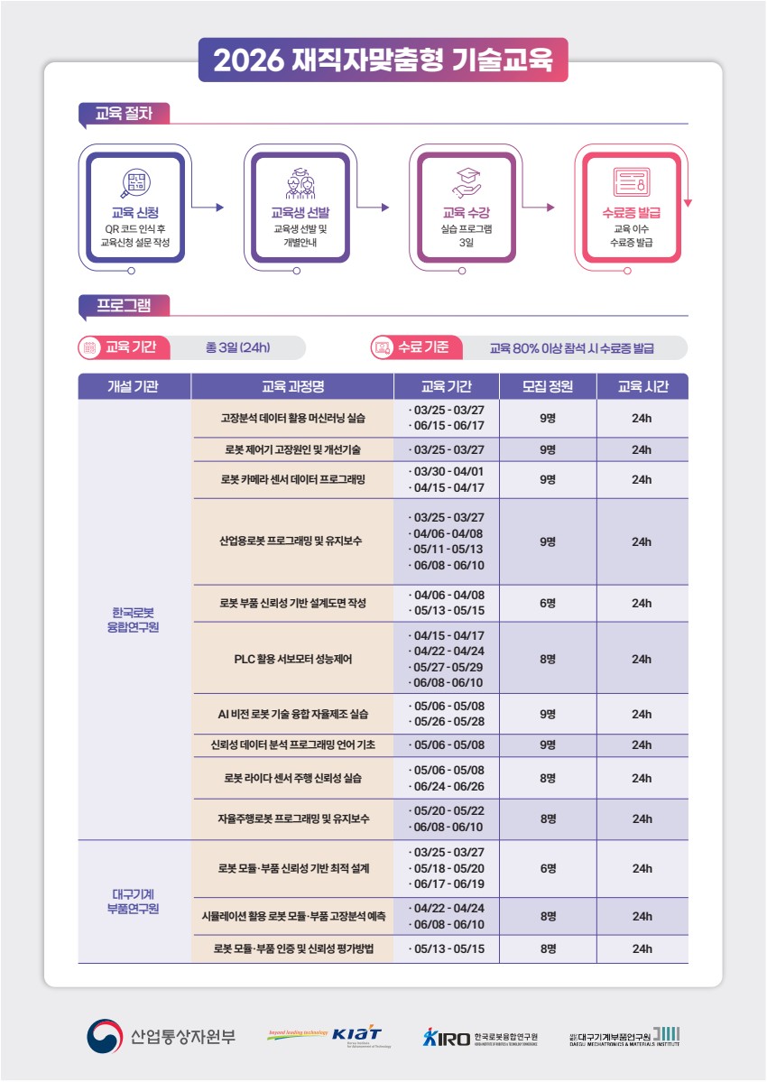 본 사업은 로봇 업계 종사자 및 관련 분야 재직자를 대상으로 ‘지능형로봇 모듈·부품 신뢰성 교육 및 실무 중심 교육’을 전액 무료로 제공하오니 관심 있는 분들의 많은 지원 부탁드립니다.
