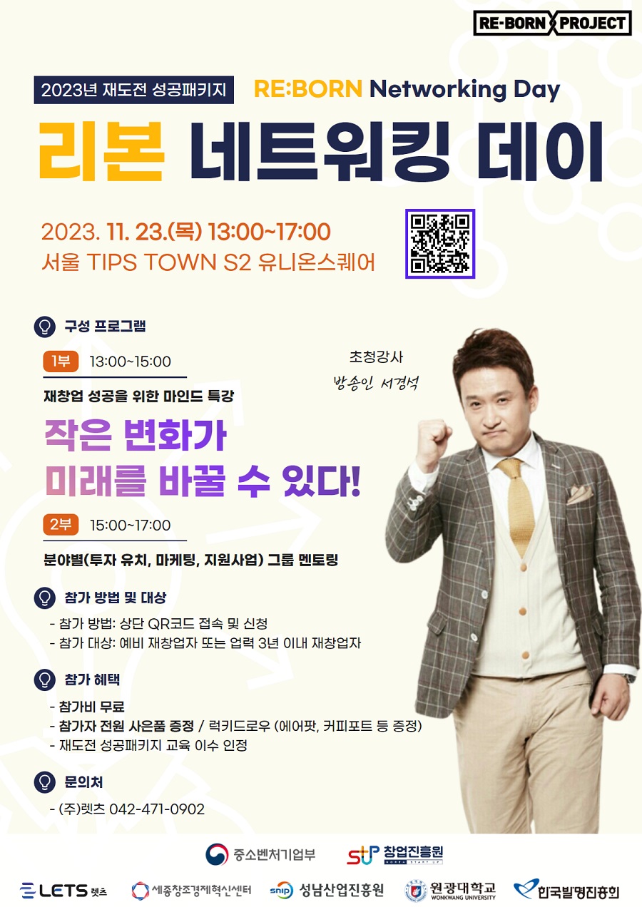 * RE:BORN 네트워킹 데이는 중소벤처기업부, 창업진흥원이 주최하며, '2023년 재도전 성공패키지' 5개 주관 기관이 함께 합니다. (주관기관: (주)렛츠, 성남산업진흥원, 세종창조경제혁신센터, 원광대학교, 한국발명진흥회)