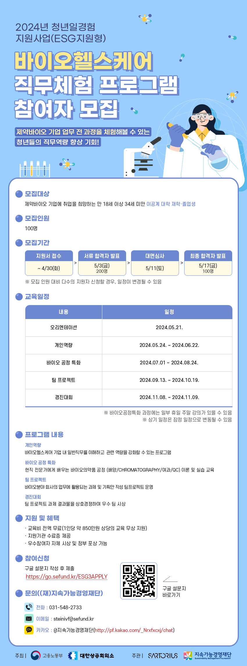 2024년 청년일경험 지원사업(ESG 지원형) '바이오헬스케어 직무체험 프로그램' 참여자 모집