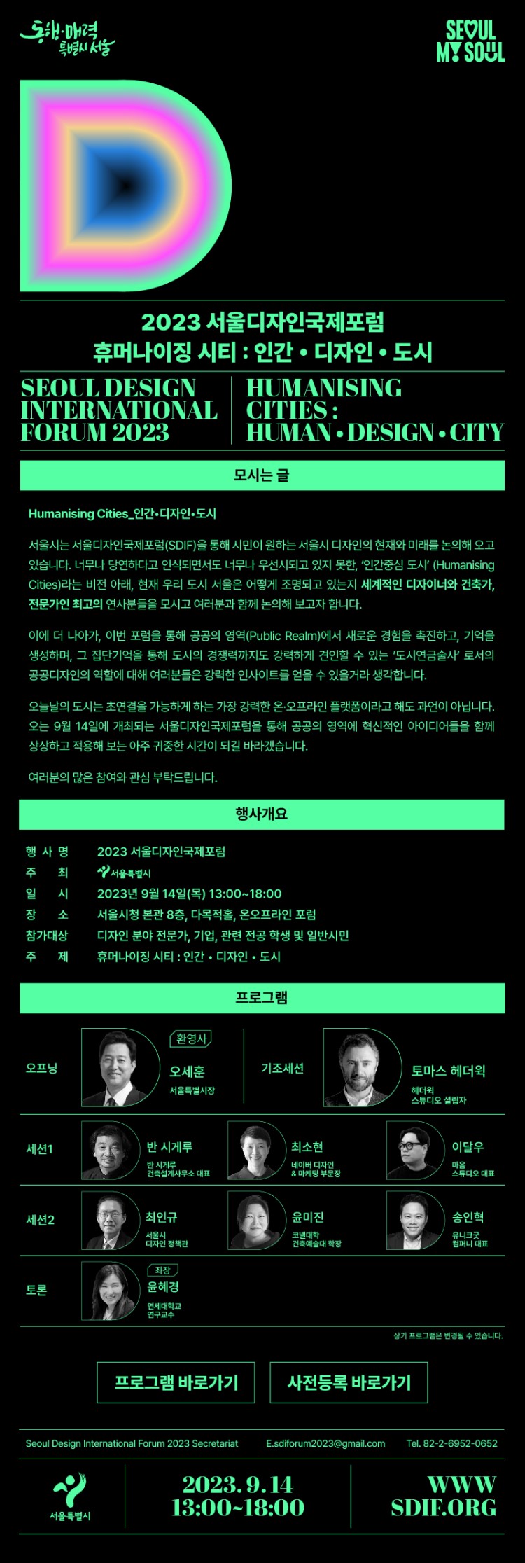 너무나 당연하다고 인식되면서도 너무나 우선시되고 있지 못한, ‘인간중심 도시’(Humanising Cities)라는 비전 아래, 현재 우리 도시 서울은 어떻게 조명되고 있는지 세계적인 디자이너와 건축가, 전문가인 최고의 연사분들을 모시고 여러분과 함께 논의해 보고자 합니다.