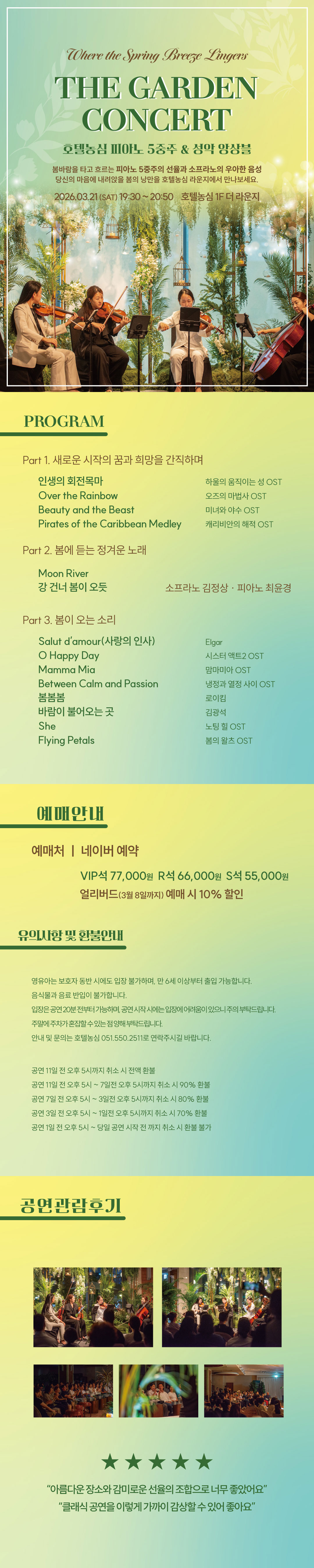 봄바람을 타고 흐르는 피아노 5중주의 선율과 소프라노의 우아한 음성. 당신의 마음에 가만히 내려앉을 봄의 낭만을 호텔농심 라운지에서 만나보세요.
