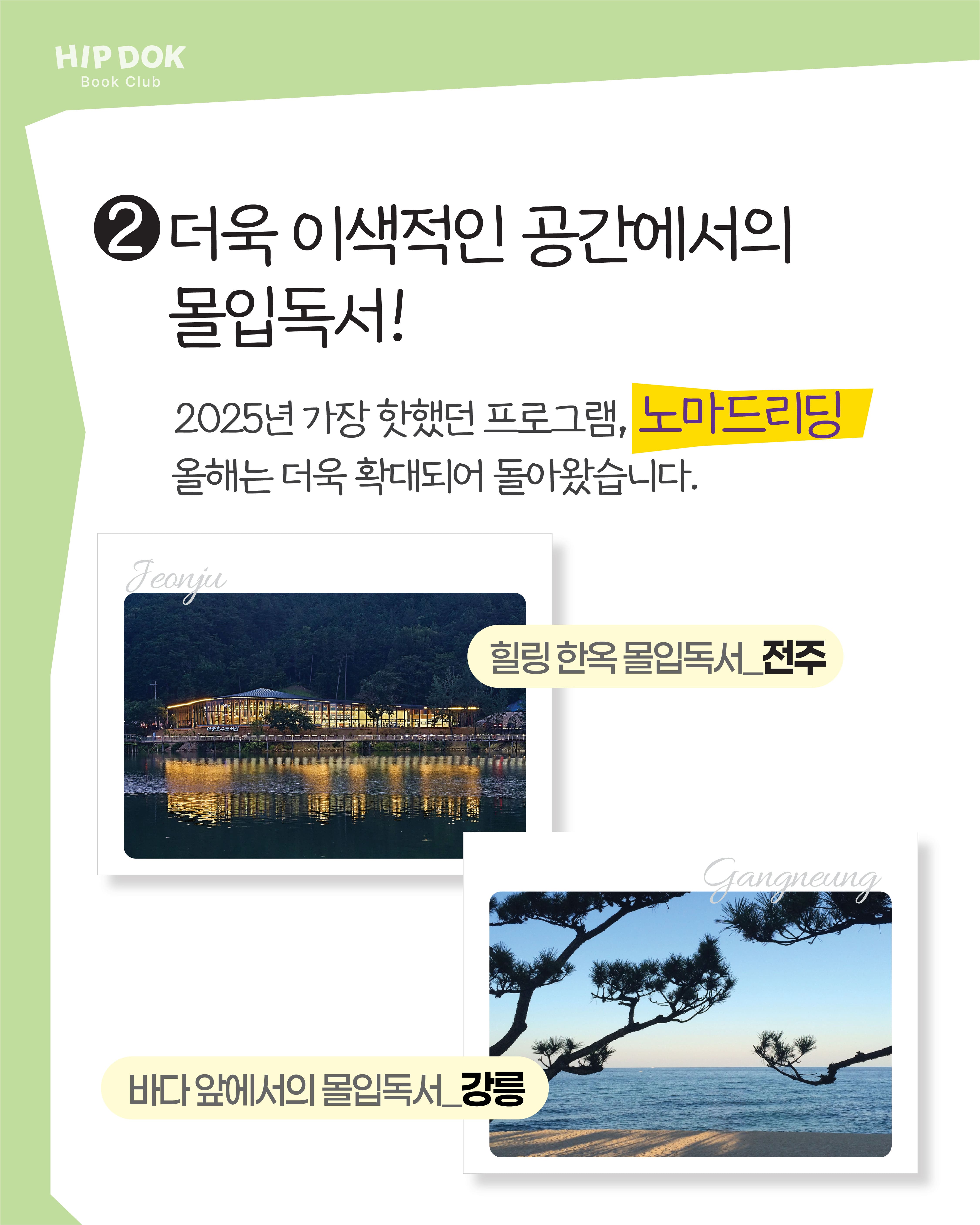 이번에는 전주 이색 도서관 투어, 강릉 바다에서의 야외독서가 예정되어 있어요.