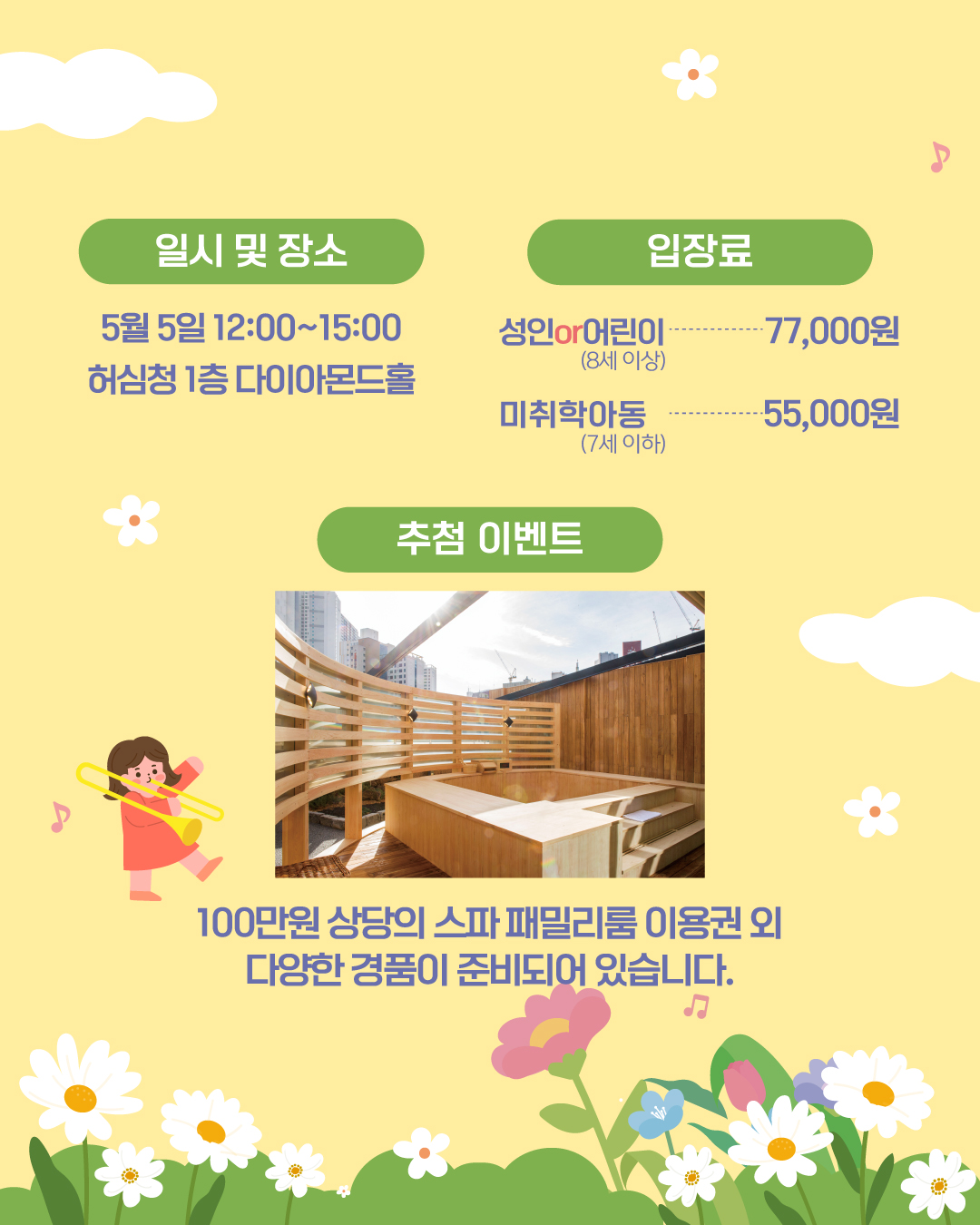 5월 5일 어린이날을 기념하여, 호텔농심 다이아몬드홀에서 어린이날 스페셜 뷔페 프로모션이 개최된다. 이번 행사는 '우리 아이에게 선물하는 완벽한 하루'라는 주제에 맞추어 가족 모두가 함께 즐길 수 있는 다채로운 프로그램으로 구성하였다. 호텔농심의 셰프가 준비한 스페셜 뷔페부터 아이와 부모가 함께 즐길 수 있는 클래식 공연, 그리고 허심청 온천 이용까지 다양한 경험을 한번에 즐길 수 있다. 더불어 어린이들을 위한 럭키드로우 이벤트와 농심의 라면&과자 선물세트 증정, 가족이 함께 추억을 남길 수 있는 포토존까지 준비되어 있어 어린이날의 특별한 추억을 선사할 예정이다.