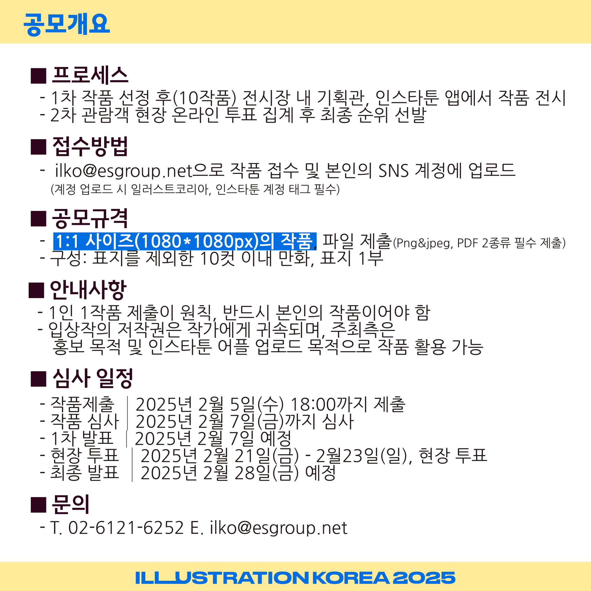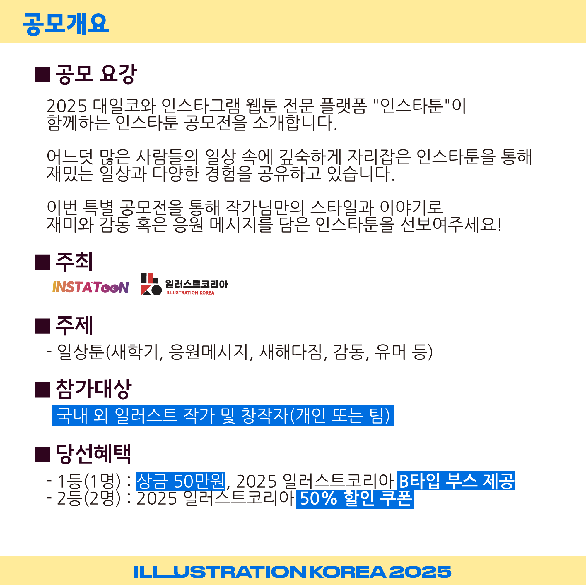 | 시상내역 | 기타 :1등(1명) 상금 50만원, 2025 일러스트코리아 B타입 부스 제공 / 2등(2명): 2025 일러스트코리아 50% 할인 쿠폰 |
