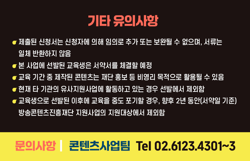 - 교육참석 및 과제수행 80% 이상 충족 시, 우수교육생 2명 선발하여 콘텐츠 창작비 지원
